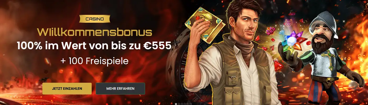 Neue Spieler erhalten einen 100% Bonus bis zu 555€ sowie 100 Freispiele für Book of Dead. Die Mindesteinzahlung beträgt 10€.