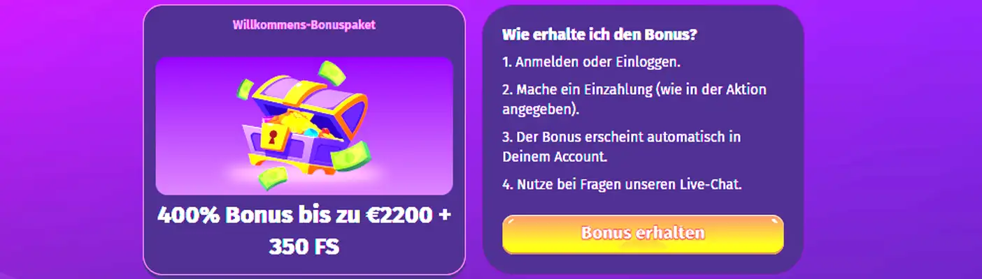 Du erhältst bis zu 400% Bonus bis zu 2.200€ sowie 350 Freispiele, verteilt auf die ersten fünf Einzahlungen. Die Mindesteinzahlung beträgt 25€ pro Bonusstufe.