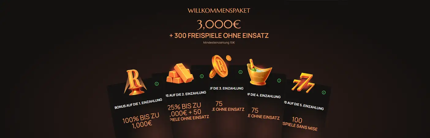 Das Willkommenspaket im Ritzo Casino ist auf mehrere Einzahlungen verteilt und kommt insgesamt auf 225% bis zu 3.000€ + 300 Freispiele ohne Einsatz. Die Struktur ist klar gestaffelt und beginnt bereits ab einer Mindesteinzahlung von 10€.